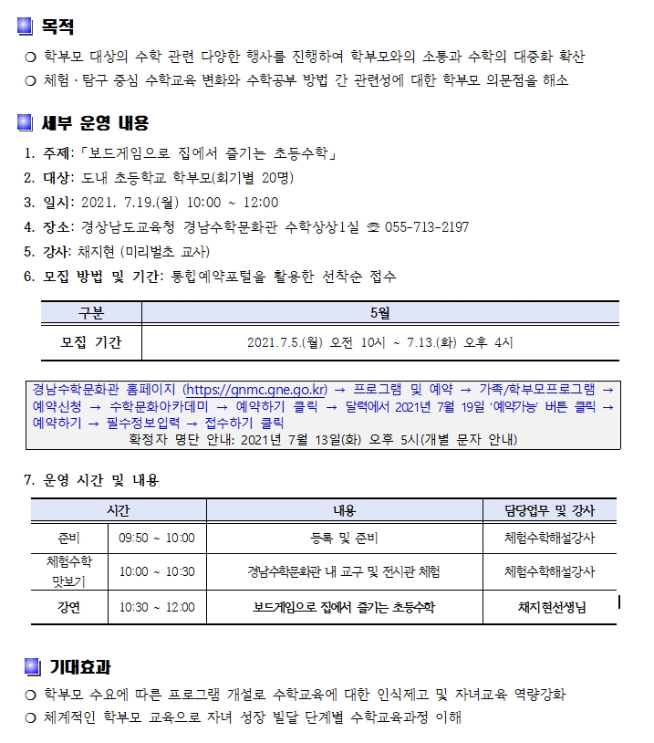 2021. 경남수학문화관 7월 수학문화아카데미 운영 안내